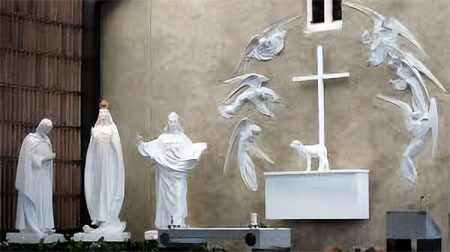 The Apparition scene at Knock has deep liturgical meaning, symbolic richness and has been the subject of theological study and contemplation for generations. Unique to the Apparition at Knock is the representation of the Eucharist as the risen Lord which appeared as the Lamb on the altar, standing before his Cross and surrounded by a host of angels. This aspect of the Apparition was detailed by the fifteen witnesses who, on 21 August 1879, stood in pouring rain for two hours reciting the rosary before the Apparition scene.